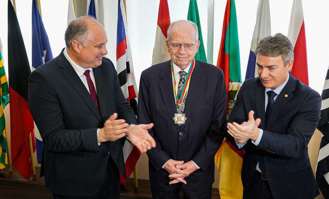 Foto: Celso Bender/ALRSO provedor da Santa Casa de Misericórdia de Porto Alegre, Alfredo Guilherme Englert, foi homenageado pelo parlamento gaúcho com a Medalha do Mérito Farroupilha. A entrega da maior honraria do Legislativo, por iniciativa do deputado Luciano Silveira (MDB), aconteceu em evento no Salão Júlio de Castilhos, nesta terça-feira (7).