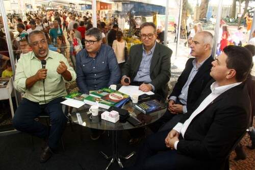 Porto Alegre – Senador Paulo Paim, Gerente com. do Senge Silvio Mezzari, Paulo Sérgio Pinto, Procurador Roberto Bandeira Pereira e o Presidente do Senge Alexandre Wollmann , no Pampa Debates, no estande da Rede Pampa, na feira do Livro. FOTO – Jackson Ciceri