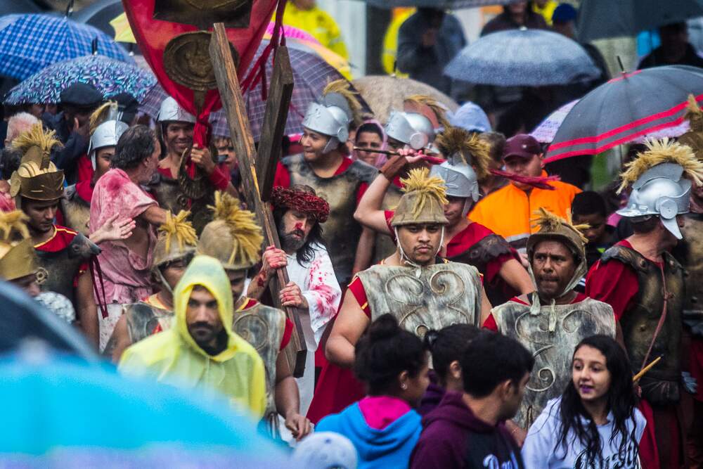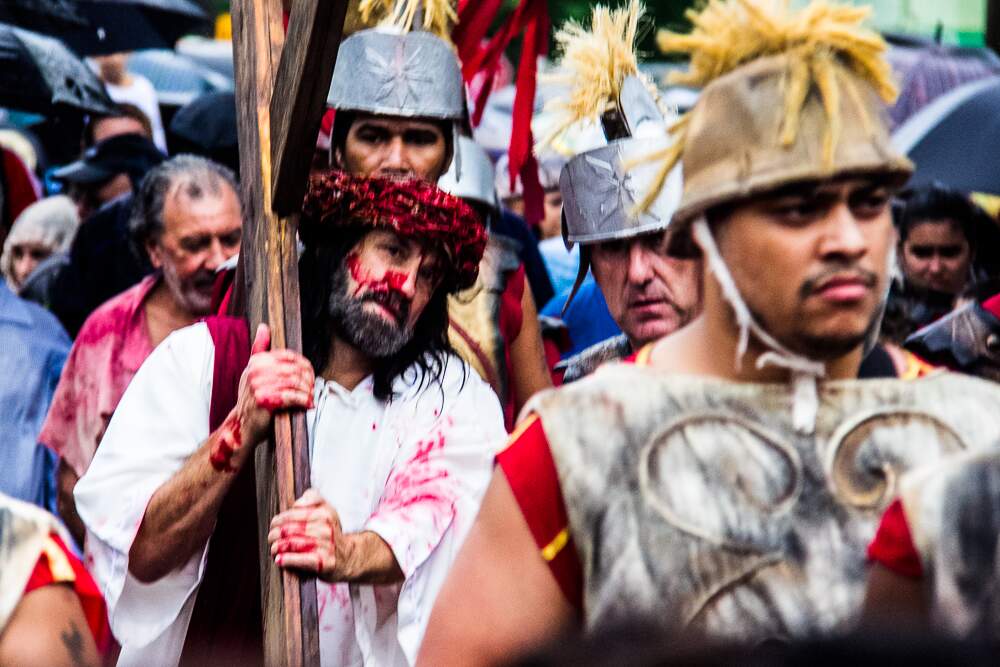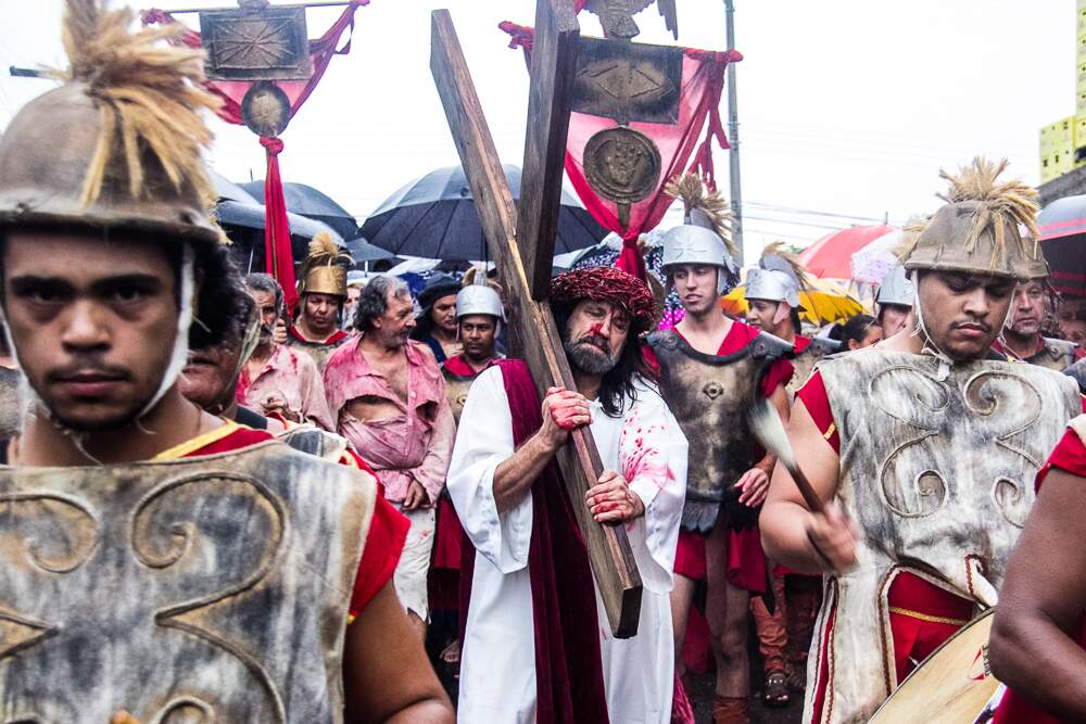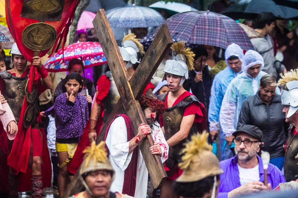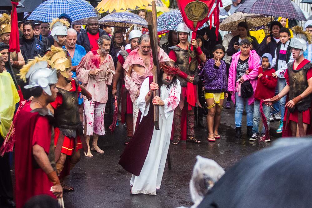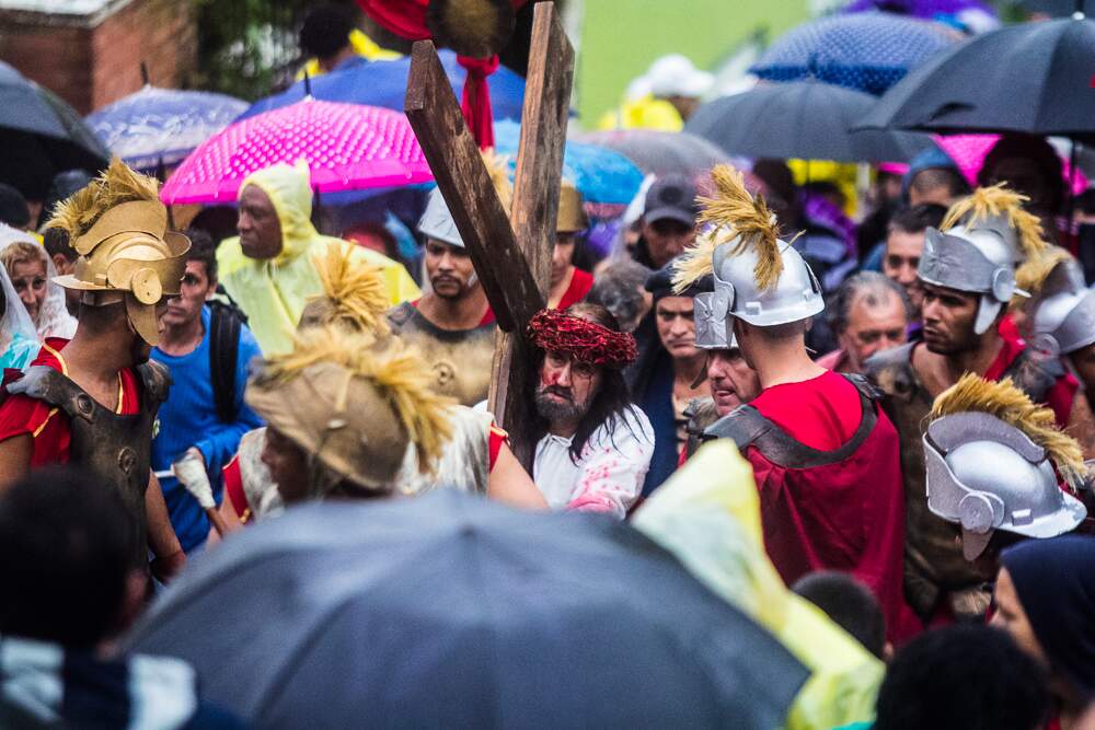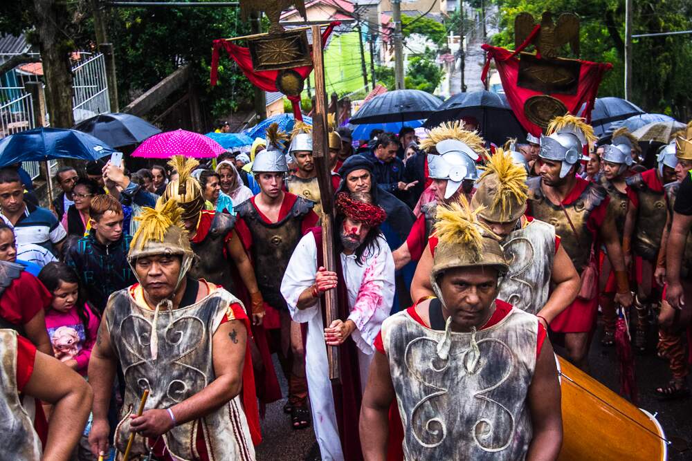 O mau tempo não afastou fiéis da Procissão da Sexta-Feira Santa em Porto Alegre. Mesmo com a chuva intensa, o público acompanhou a encenação da Paixão de Cristo no Morro da Cruz.