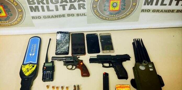 Os policiais militares apreenderam ainda um jammer bloqueador de sinal, um detector de metal portátil, um radiocomunicador e R$ 44,00 em dinheiro, além de quatro telefones celulares. Dois veículos usados pela quadrilha também foram recolhidos.