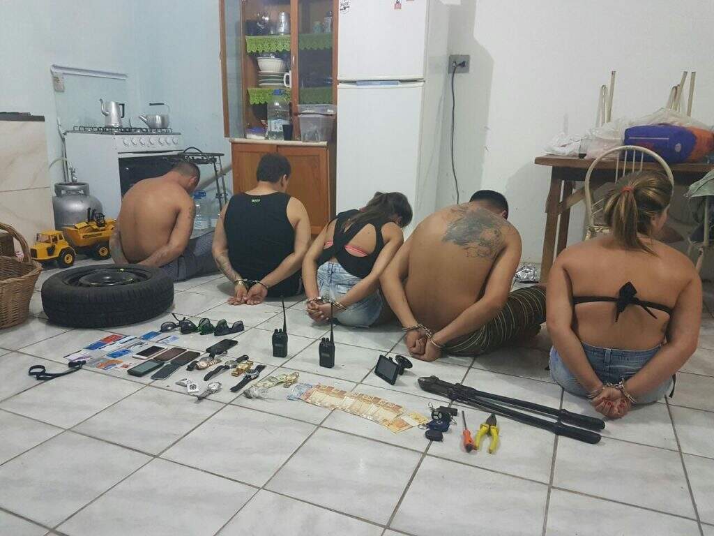 Na ação, cinco indivíduos foram presos com duas EcoSport clonadas, R$ 350, 6 aparelhos celulares, 12 cartões de crédito, 44 pneus furtados, 2 rádios na frequência da BM e 7 relógios. Além disso, dois aparelhos bloqueadores de sinal foram apreendidos.