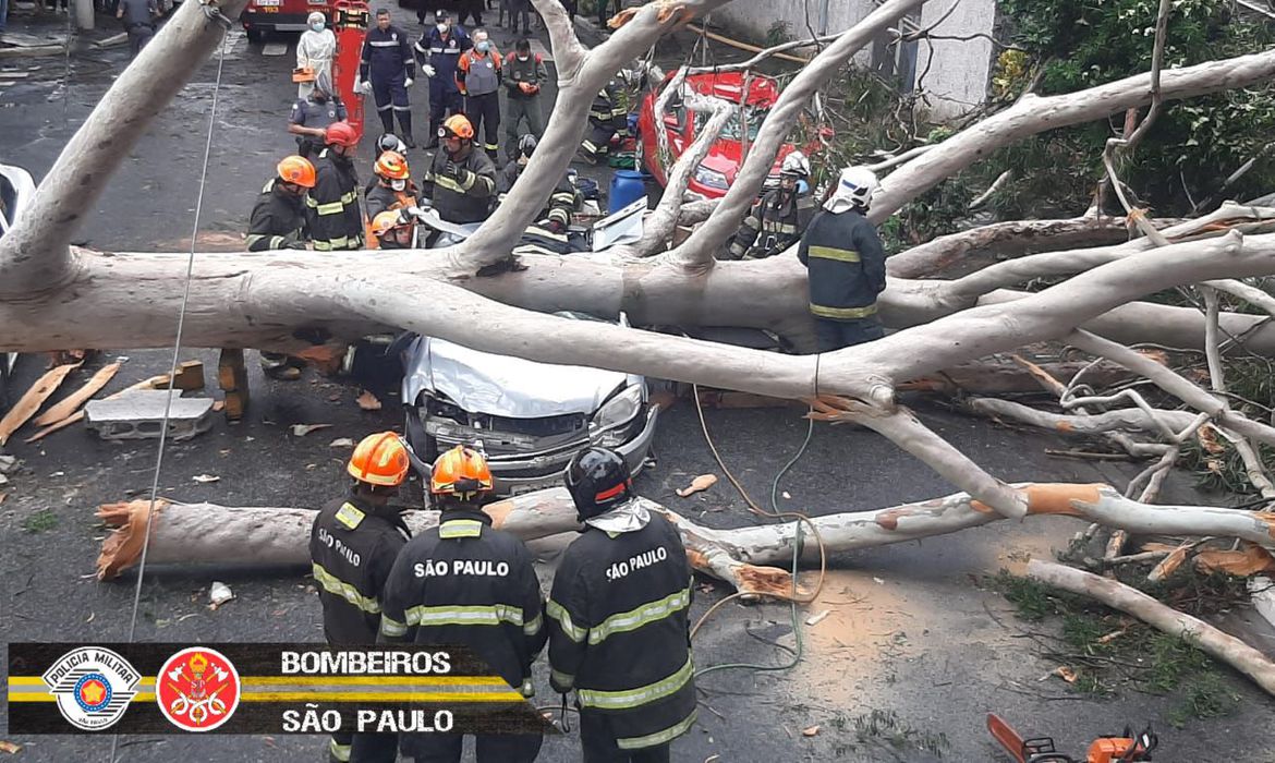 Foto: Corpo de Bombeiros/SPA queda de uma árvore sobre um veículo na tarde desta terça-feira (1º) causou a morte de uma mulher na Vila Mariana, na capital paulista. De acordo com o Corpo de Bombeiros, o óbito foi atestado pelo médico do Helicóptero Águia da Polícia Militar, que participou do socorro à vítima.