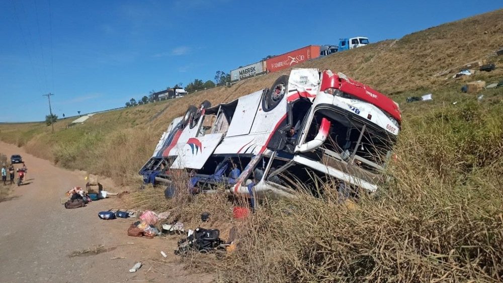 Por motivos ainda desconhecidos, o ônibus saiu da rodovia para o canteiro lateral e capotou na ribanceira, que tem cerca de 20 metros em relação ao nível da pista.