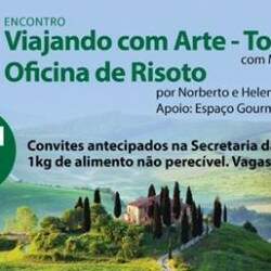 Como acontece tradicionalmente, a SABA mantém uma extensa programação social, cultural e esportiva para atender aos seus associados e aos veranistas como um todo nos meses de janeiro e fevereiro, com diferenciais. Na próxima quinta-feira, dia 14 de janeiro a agenda inclui um bate-papo intitulado “Viajando com arte”, sob a tutela de Mylena Rizzo, que vai detalhar as riquezas e as belezas de uma região extradorinária da Itália, a Toscana, repleta de cores e sabores. Como complementação a esta programação, um item que integra a agenda gastronômica do encontro, uma oficina de risoto com o casal Helena e Norberto Gorziza, do Espaço Gourmet Blue Ville. Eles prepararão um “Risoto de presunto Parma com abacaxi” , ofertado pela empresa. Horário 20h. Ingresso 1 kg de alimento.