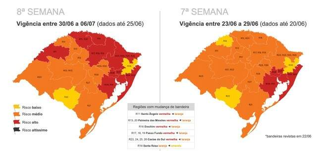 Foto: Reprodução/Governo RSApós a notificação de que nove das 20 regiões do mapa de distanciamento controlado do Estado do Rio Grande do Sul estão na bandeira vermelha, cidades enviaram recursos para o governo estadual revisar os dados considerados na análise. Os municípios tinham até a manhã deste domingo (28) para contestar.