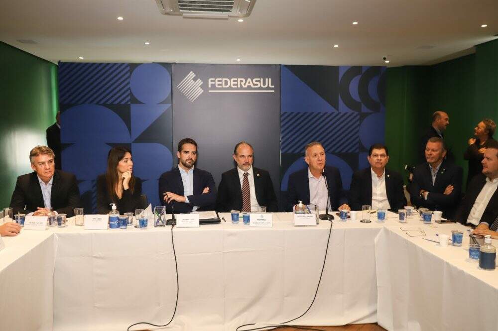O relator da Proposta de Emenda à Constituição (PEC) da Reforma Tributária no Congresso Nacional, o deputado federal Aguinaldo Ribeiro, participou de um encontro com o governador Eduardo Leite, demais deputados e lideranças empresariais na Federasul, em Porto Alegre.