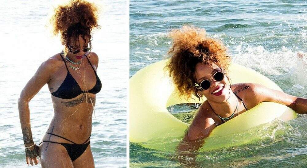 Rihanna aproveitou o dia ensoladado para se bronzear em uma praia de Barbados, no Caribe. A cantora foi fotografada enquanto se divertia na água com uma boia e ainda chamou a atenção por estar toda maquiada no mar.