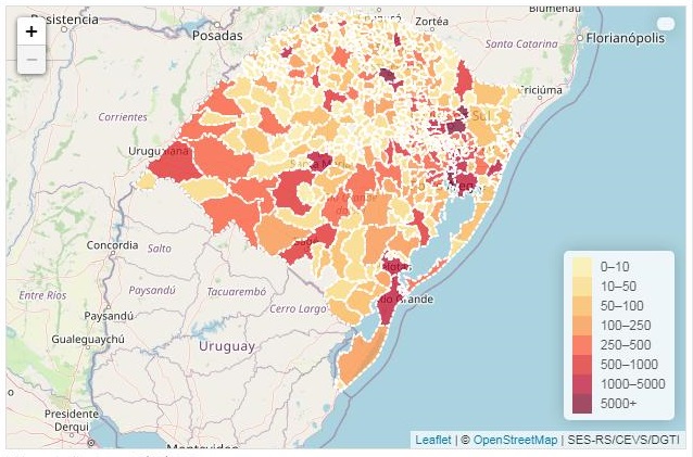 A doença está presente em quase a totalidade do estado: apenas 11 das 497 cidades gaúchas não apresentam registros da Covid-19.