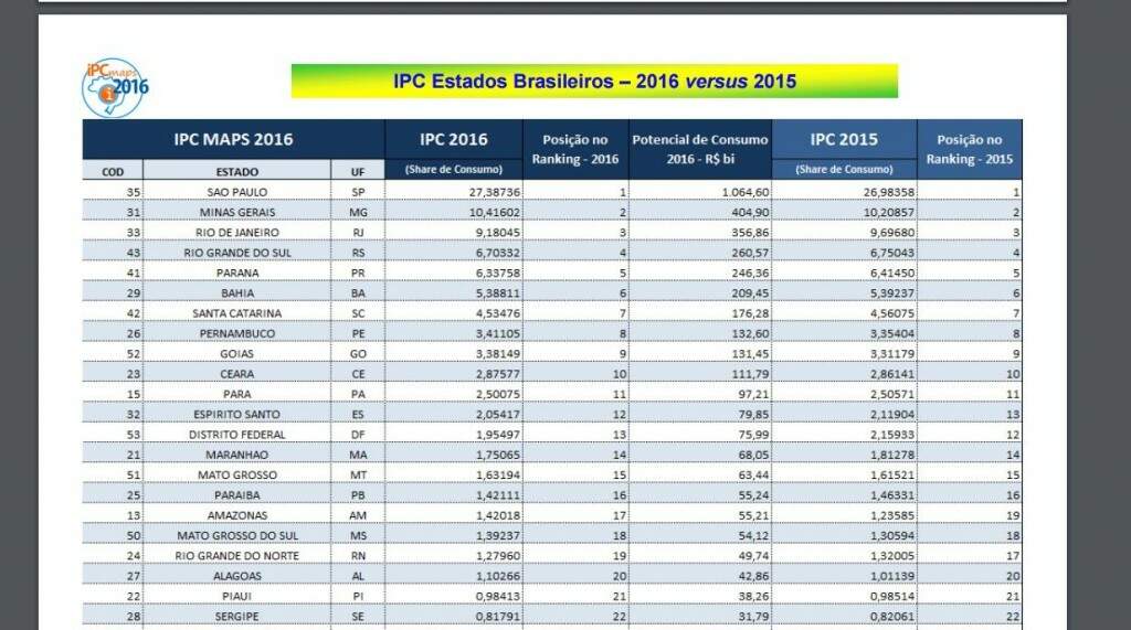 O Rio Grande do Sul ficou em quarto lugar no Brasil em potencial de consumo para este ano, segundo o IPC (Índice de Potencial de Consumo) Maps, um levantamento realizado pela IPC Marketing Editora. Em primeiro lugar ficou o Estado de São Paulo, seguido de Minas Gerais e Rio de Janeiro. O consumo potencial total dos gaúchos para 2016 é de cerca de 260 bilhões de reais, conforme a projeção.