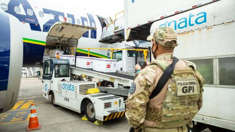 Caixas térmicas chegaram em avião que pousou antes das 10h desta segunda (21) no aeroporto de Porto Alegre.