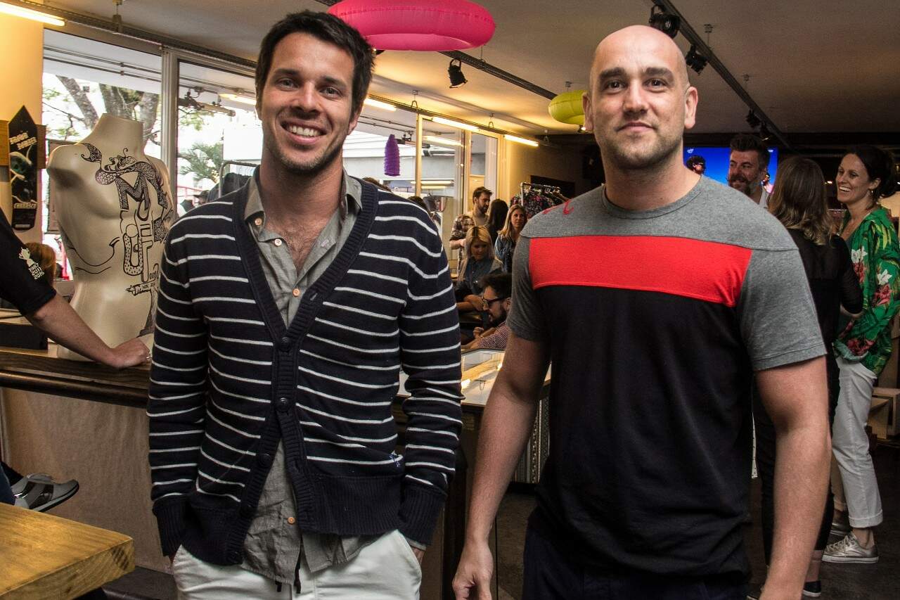 O estilista Jayme Kersting e Felipe Candemil Schweitzer estiveram visitando a feira de moda. (Foto: Jackson Ciceri/O Sul)