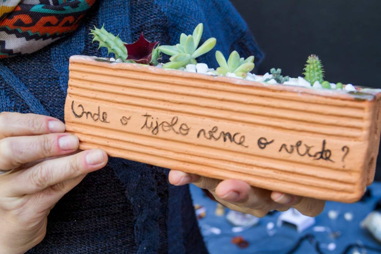 No detalhe: a frase questionadora “Onde o tijolo vence o verde?”. (Foto: Pedro Antonio Heinrich/especial)