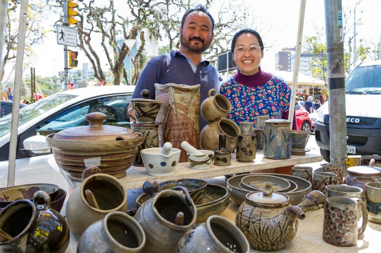 O casal Emília e Tomohiro Ehara, responsáveis por uma bela produção de artesanato em cerâmica oriental, exibe suas peças aos sábados, no Brique da Redenção. (Foto: Pedro Antonio Heinrich/especial)
