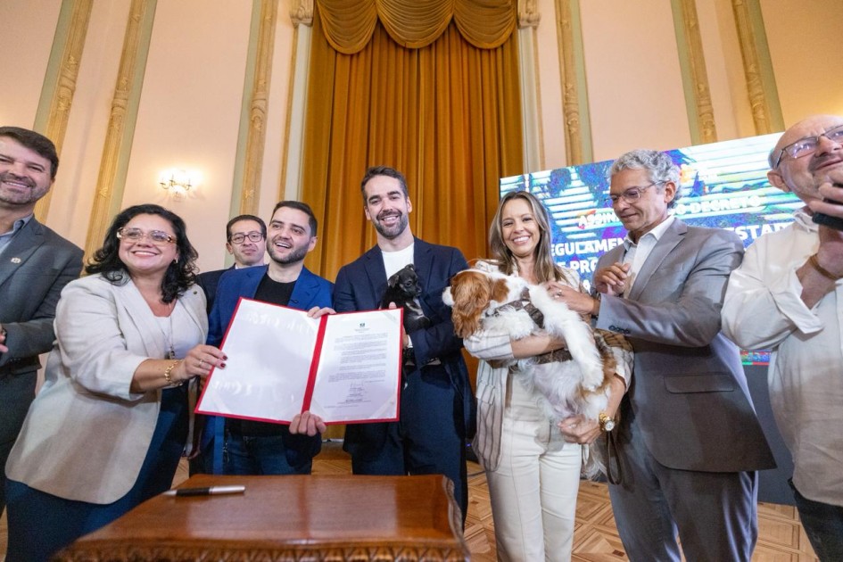 O ato, realizado no Palácio Piratini, reuniu autoridades e representantes da causa animal, entre eles o cão Calvin James, embaixador da coluna Conexão Pet, do jornal O Sul, e do projeto Causa Animal. Sua presença reforça a aproximação entre políticas públicas e mobilização social — um dos eixos centrais para a consolidação de iniciativas na área.
