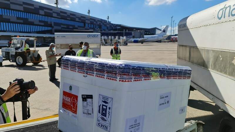 Na manhã desta quinta (29), 353.750 doses da vacina AstraZeneca foram descarregadas de avião vindo de Guarulhos (SP).