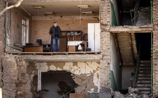 Detalhe de prédio que teve a fachada derrubada após bombardeio russo a uma fábrica de mísseis nesta madrugada.
