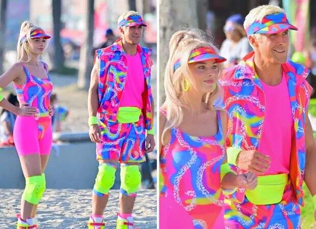 Foto: DivulgaçãoRyan Gosling e Margot Robbie foram clicados andando de patins durante as gravações do filme “Barbie”, que estreia em 2023. Usando roupas coloridas e chamativas com a mesma estampa, os atores mostraram a habilidade nos patins.