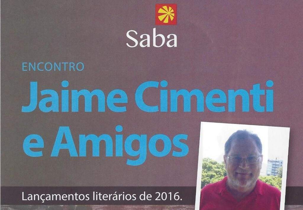 Nesta sexta-feira (5), a Saba (Sociedade dos Amigos do Balneário de Atlântida) receberá o encontro Jaime Cimenti e Amigos – Lançamentos Literários 2016. Durante o evento, que inicia às 20h na Sede Social, acontecerá uma sessão de autógrafos com Aziz Jamal, Abrão Aspis, Ernesto J. Silveira Netto e Tatiana Fadel Rihan. Após, terá uma roda de samba com direito a caipirinha.