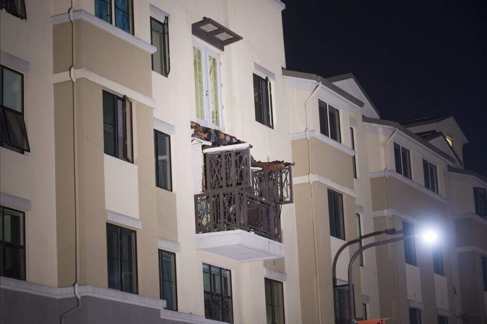 Fotos do local mostraram que a sacada do quarto andar cedeu e caiu sobre a sacada do andar de baixo no complexo de apartamentos Library Gardens, a cerca de dois quarteirões do campus da universidade, que faz frente para a baía de San Francisco.