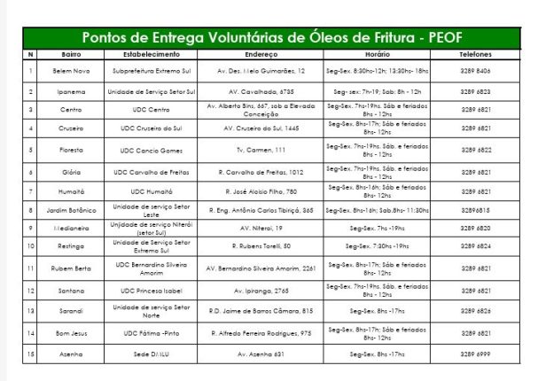 “Precisamos ter consciência de que o descarte incorreto do óleo de cozinha vai muito além do entupimento de pias e canos em nossas casas. É fundamental que a população compreenda os graves impactos causados por esse resíduo, que quando jogado na rede de esgoto polui rios e arroios, o que pode ser evitado com pequenas atitudes, como guardar o que restou do óleo usado em uma em garrafa, bem fechada, e depois levar esse material até um ponto de entrega. Por isso, para facilitar esse descarte correto, o DMLU disponibiliza os PEOF em diversas regiões da Capital”, destaca o diretor-geral do DMLU, Carlos Alberto Hundertmarker.
