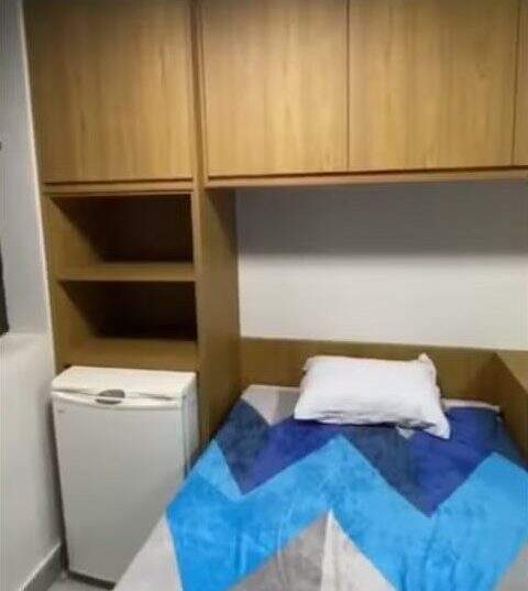 O quarto é formado por uma sala com mesa, cadeira e cama de solteiro e um banheiro privativo