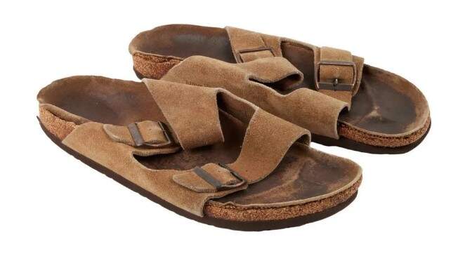 “As sandálias são bem usadas, mas ainda parecem intactas”, diz a descrição do item. “A palmilha de cortiça e juta mantém a marca dos pés de Steve Jobs, moldada após anos de uso”.