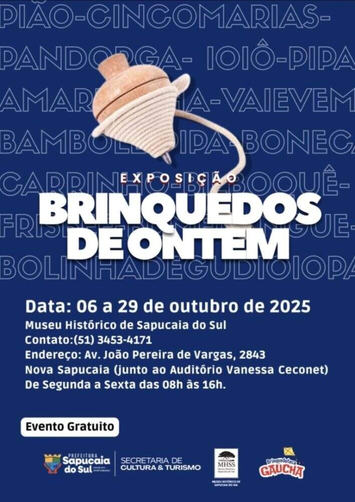 O Museu Histórico de Sapucaia do Sul (MHSS) abre as portas para uma viagem ao universo lúdico da infância com a exposição “Brinquedos de Ontem”, realizada em parceria com a Brinquedoteca Gaúcha. De 6 a 29 de outubro de 2025, o público poderá conferir brinquedos que marcaram gerações e que hoje são raridades fora do mercado atual.