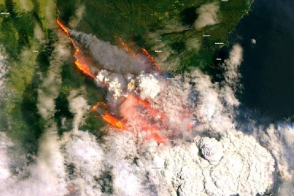 Imagens tiradas de satélites no espaço, no sábado (04), mostram espessas nuvens de fumaça tóxica que se elevam pela atmosfera com o avanço dos incêndios catastróficos na Austrália.