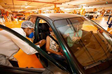 Foto: Cristine Rochol/PMPAA Secretaria Municipal de Saúde de Porto Alegre orienta que as pessoas não cheguem a pé nos drive-thrus para se vacinar. Há risco de caminhar junto aos carros e a organização é feita conforme a chegada dos veículos.