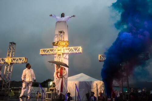 Porto Alegre 2016 – Encenação da Paixão de Cristo no Morro da Cruz. Procissão Sexta Feira Santa. Jesus Cristo , fiéis acompanham a cerimônia mesmo com chuva intensa . Ressurreição . FOTO Jackson Ciceri