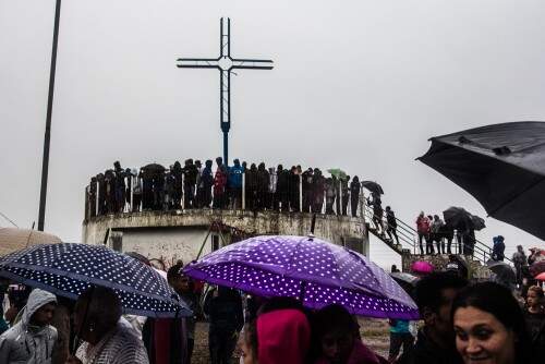 Porto Alegre 2016 – Encenação da Paixão de Cristo no Morro da Cruz. Procissão Sexta Feira Santa. Jesus Cristo , fiéis acompanham a cerimônia mesmo com chuva intensa . FOTO Jackson Ciceri