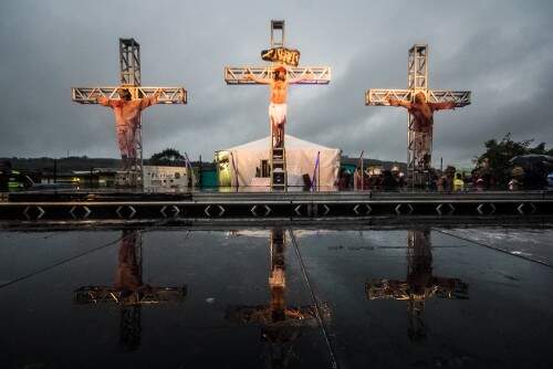 Porto Alegre 2016 – Encenação da Paixão de Cristo no Morro da Cruz. Procissão Sexta Feira Santa. Jesus Cristo , fiéis acompanham a cerimônia mesmo com chuva intensa .Crucificação . FOTO Jackson Ciceri