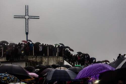 Porto Alegre 2016 – Encenação da Paixão de Cristo no Morro da Cruz. Procissão Sexta Feira Santa. Jesus Cristo , fiéis acompanham a cerimônia mesmo com chuva intensa . FOTO Jackson Ciceri