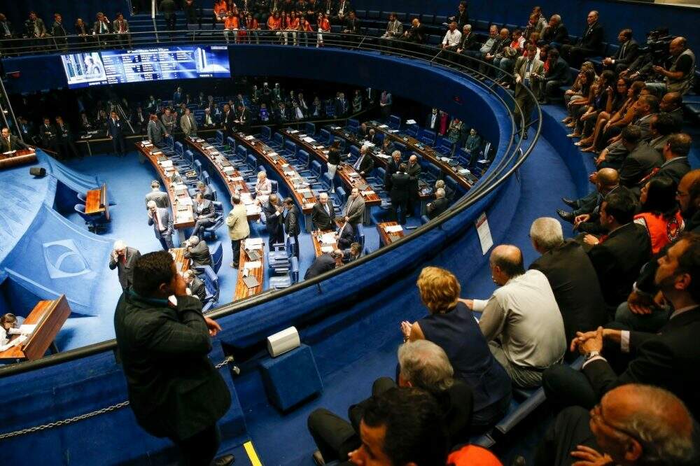 Calheiros precisou suspender duas vezes a sessão por conta de manifestações de integrantes da Força Sindical. Na primeira ocorrência de protesto, os sindicalistas começaram a gritar nas galerias usando máscaras com a imagem de Dilma Rousseff com chifres. Eles cantaram o Hino Nacional e gritaram “Fora, PT”. Calheiros suspendeu a sessão. Depois, recuou e permitiu a presença dos sindicalistas, contanto que eles permanecessem em silêncio. Por volta das 21h20min, os ativistas voltaram a se manifestar e Calheiros interrompeu a sessão novamente. Antes, no fim da tarde, sindicalistas da Central Única dos Trabalhadores jogaram esterco na passagem dos carros oficiais dos senadores.