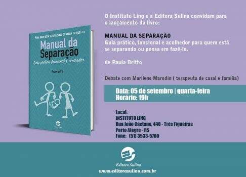 Por entender uma necessidade geral de normalizar dúvidas e dores recorrentes no processo de separação, a advogada Paula Britto concebeu, em uma linguagem acessível, distante dos termos técnicos que envolvem o Direito de Família, o Manual da Separação – Guia prático, funcional e acolhedor (Editora Sulina, 126 páginas, R$35,00 ISBN: 978-85-205-0825-1).