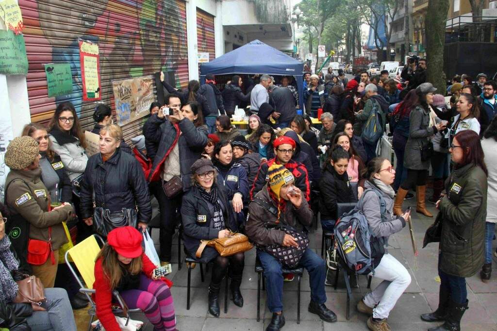 Servidores municipais realizaram um protesto na manhã desta segunda-feira na Capital. Eles concentraram-se em frente ao prédio da Secretaria Municipal de Educação, localizado na rua dos Andradas, no Centro, e impediram a entrada de colegas e funcionários terceirizados. Para marcar o 14º dia de greve da categoria, os municipários simularam aulas na calçada em frente ao local e exibiram cartazes.