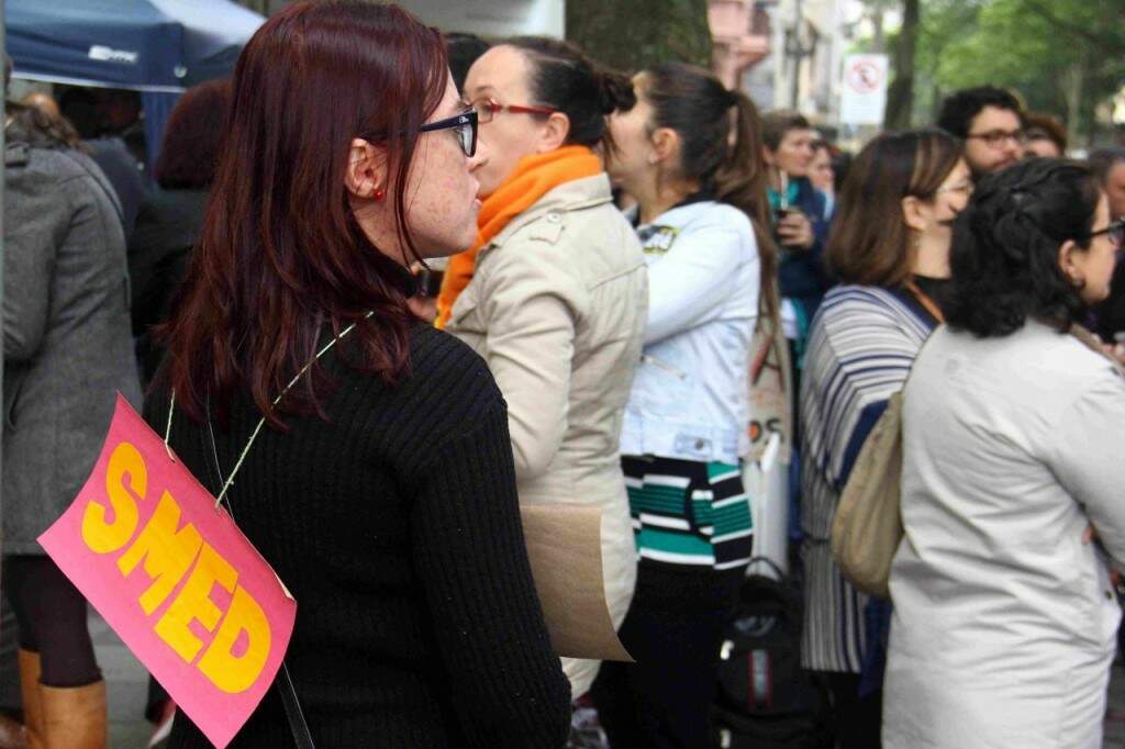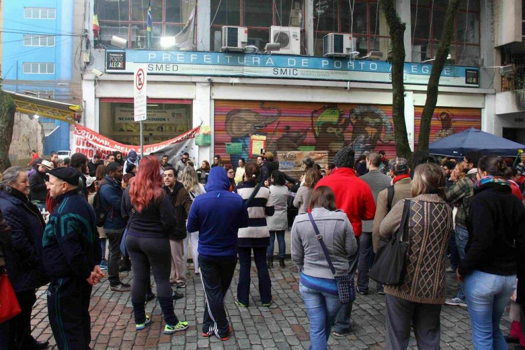Servidores municipais realizaram um protesto na manhã desta segunda-feira na Capital. Eles concentraram-se em frente ao prédio da Secretaria Municipal de Educação, localizado na rua dos Andradas, no Centro, e impediram a entrada de colegas e funcionários terceirizados. Para marcar o 14º dia de greve da categoria, os municipários simularam aulas na calçada em frente ao local e exibiram cartazes.
