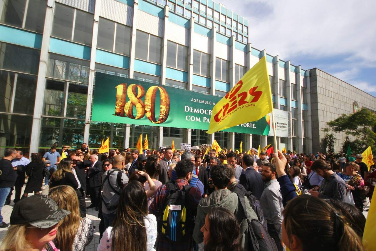 Servidores estaduais e representantes de sindicatos, entre eles o Cpers, ficaram desde as 8h da manhã em frente à Assembleia Legislativa. Acampados na Praça da Matriz, eles bloquearam os acessos ao prédio do Legislativo. Por volta das 10h, houve empurra-empurra entre servidores e seguranças em frente ao Memorial da Assembleia. O presidente da Casa, Edson Brum (PMDB), foi cercado por manifestantes. O clima ficou muito tenso. Brum teve de ser escoltado por seguranças para conseguir se locomover. O Batalhão de Operações Especiais chegou a ser acionado.