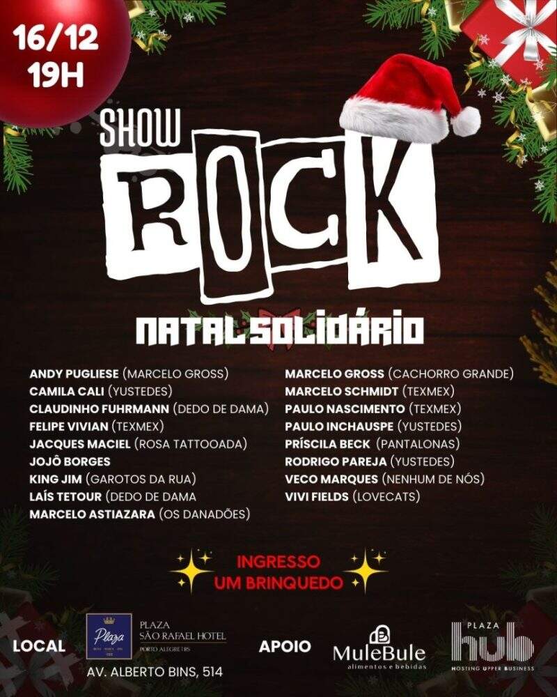 Show Rock Natal Solidário – Entrada gratuita. Dia 16 de dezembro de 2025 às 19h, terça-feira. No Plaza São Rafael – Centro de Porto Alegre. Avenida Alberto Bins 514. Ingresso mediante a doação de brinquedo novo ou usado em ótimo estado. Instagram do Plaza HUB https://www.instagram.com/plazahub ou pelo site www.plazahoteis.com.br. Número de acessos limitados.