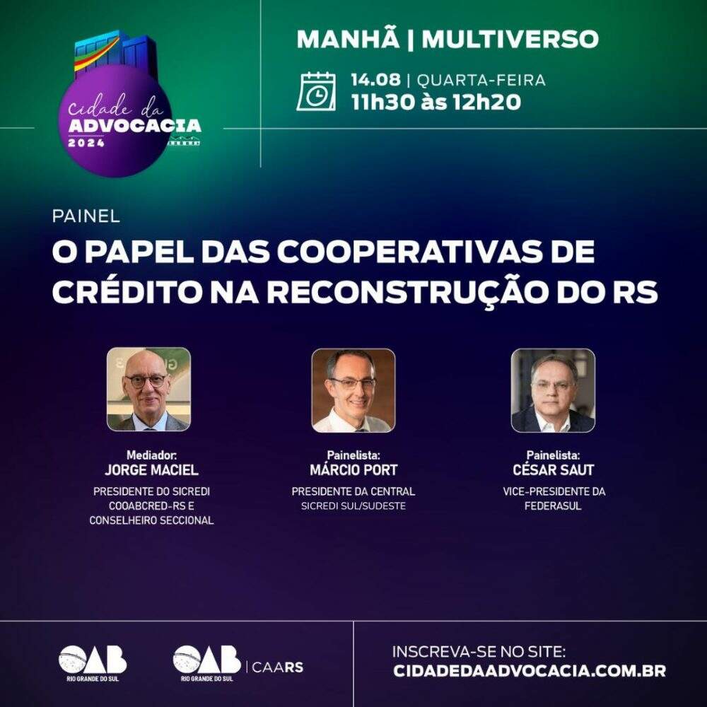 O Sicredi participará, nesta quarta-feira (14), a partir das 11h30, do painel sobre o movimento de retomada do desenvolvimento econômico no Rio Grande do Sul a partir da perspectiva do cooperativismo de crédito na Cidade da Advocacia 2024.