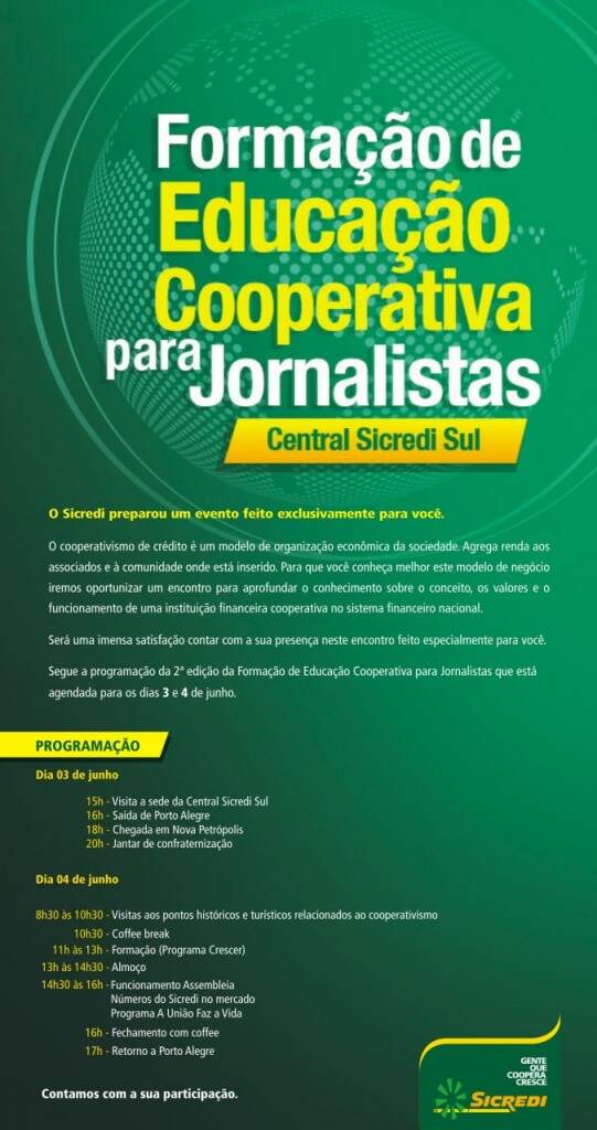 O Sicredi realiza hoje (03) e amanhã (04), em Nova Petrópolis, a 2ª edição da Formação de Educação Cooperativa para Jornalistas, para profissionais do Rio Grande do Sul e de Santa Catarina. Integrante do processo de educação continuada dos Programas de Relacionamento da Central Sicredi Sul, tem por objetivo priorizar a formação dos formadores de opinião, para um entendimento mais aprofundado e qualificado sobre o universo cooperativista e do cooperativismo de crédito.