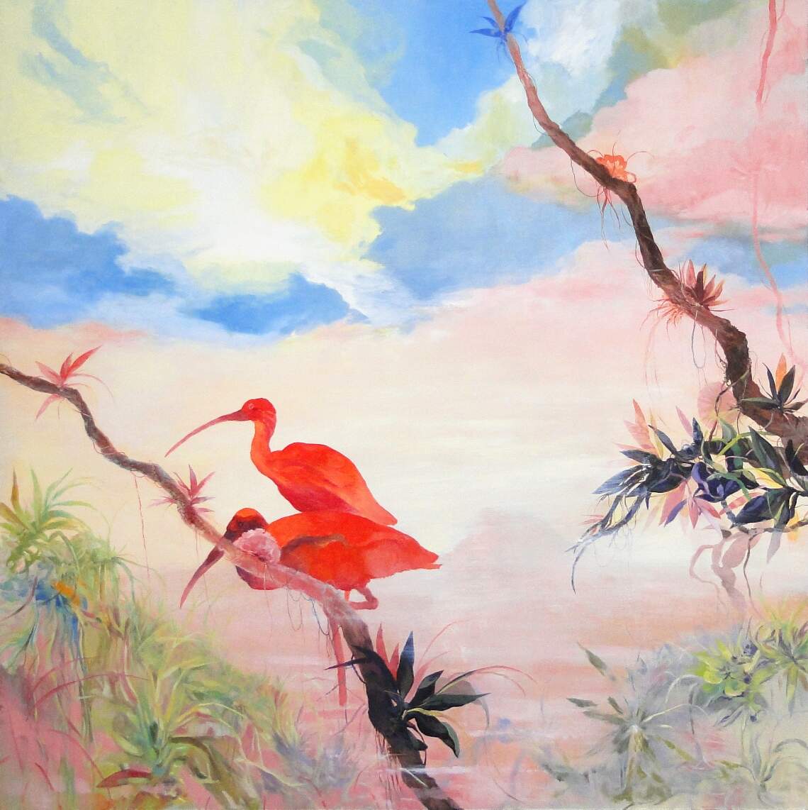 O óleo sobre tela “2 guarás” homenageia a ave, tradicionalmente vista no litoral do Amapá e em São Paulo. (Foto: Divulgação)