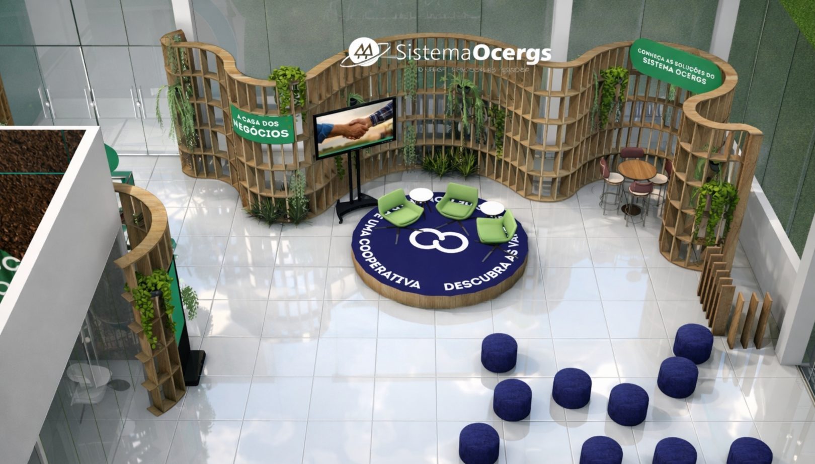 Com ambientes destinados a reuniões, encontros institucionais e ativações, o espaço foi concebido para funcionar como ponto de apoio às cooperativas presentes na feira. Mais do que apresentar produtos, a proposta é viabilizar oportunidades comerciais e fortalecer relações estratégicas.