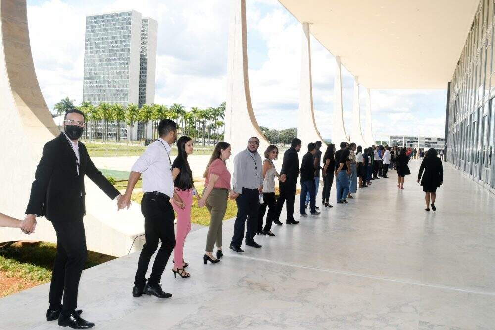 Ministros, servidores e terceirizados do Supremo Tribunal Federal (STF) uniram-se de mãos dadas para dar um abraço no prédio, na Praça dos Três Poderes, em Brasília (DF). O ato simbólico foi organizado pelos trabalhadores