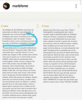 Em um novo documento, publicado por ela nesta quinta-feira (23), consta que não fora detectado componentes suficientes de álcool ou de drogas no organismo da instagrammer. No texto acima, Mariana, conta que o médico legista afirmou que ela ainda estava “sob efeito da droga”. Já na descrição dos novos laudos, ela questionou: “Cadê toda a bebida que todos alegam em depoimento que eu bebi, que eu estava bêbada?!”. No mesmo texto, quando ela cita o resultado da coleta do material vaginal, calcinha e body que utilizava no dia, questiona: “Como o laudo dá ‘nada consta’ se tem esperma na calcinha e não tem no macaquinho (body)? Sendo que em nenhum momento as peças foram separadas?”.