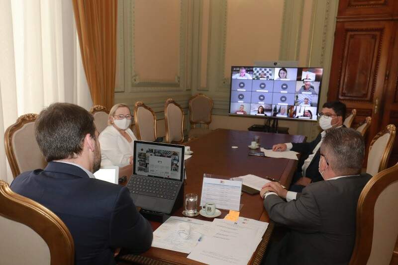 Governador Leite e integrantes do governo em reunião por videoconferência com prefeitos e diretoria da Famurs.