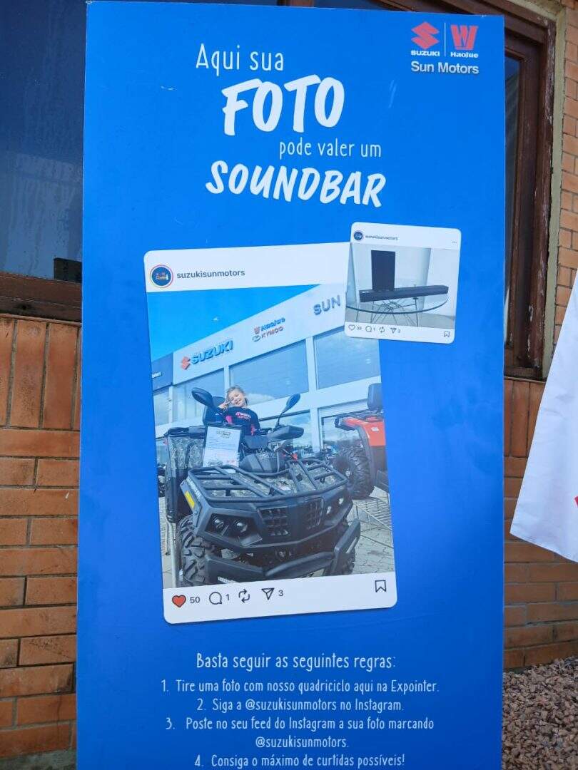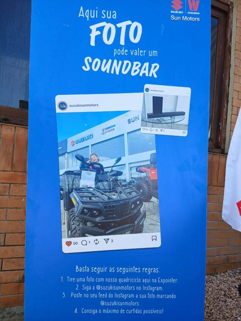 Durante a Expointer, os visitantes da Casa da Pampa estão convidados a participar da promoção “Fotografe o Seu Hisun”. Basta registrar uma imagem criativa de um dos quadriciclos em exposição, postar nas redes sociais com a #suzukisunmotors. A foto mais curtida até o final da feira ganhará um soundbar exclusivo — porque potência também merece som à altura.