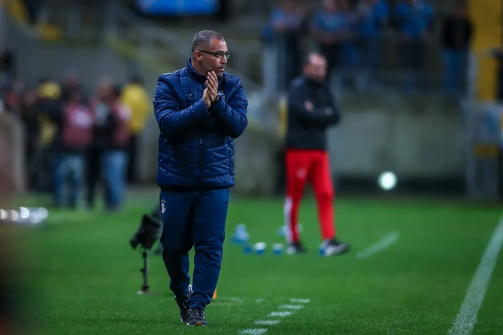 Foto: Lucas Uebel/GrêmioA vitória do Grêmio em cima do Vila Nova nesta sexta-feira (02) teve o comando do técnico interino César Lopes pelo menos dentro da Arena, já que Renato Portaluppi, o novo treinador contratado, comandou por rádio diretamente do Rio de Janeiro.