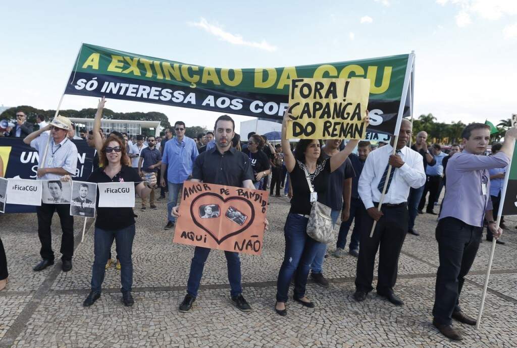 Com gritos de “Fora, Fabiano” e “Temer, demite”, um grupo de servidores públicos protesta nesta segunda-feira (30) em frente ao Palácio do Planalto pela exoneração do ministro de Transparência, Fiscalização e Controle, Fabiano Silveira.