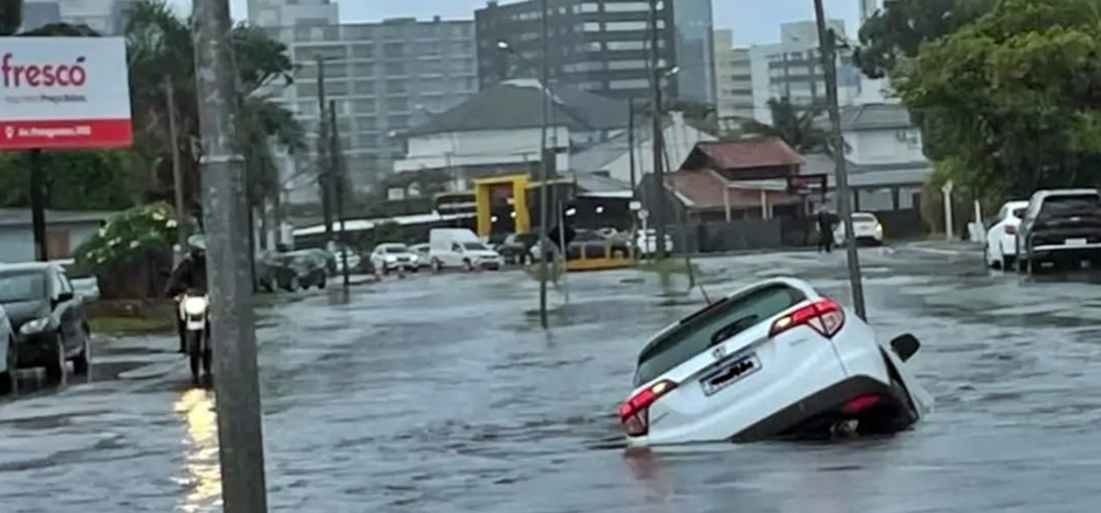 Em Capão da Canoa, no Litoral Norte gaúcho, um carro acabou caindo em uma vala aberta pela força da água em meio aos alagamentos registrados em diversas ruas da cidade.